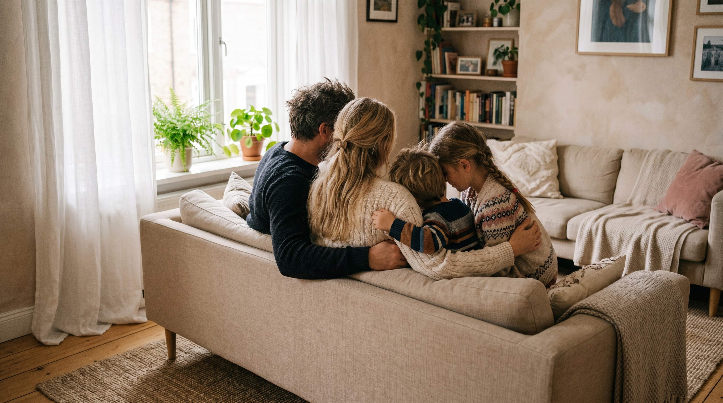 SCENE: Светлая комната, большое окно справа с дневным светом. Размытый фон - книжная полка, мягкий плед. Ощущение уюта.